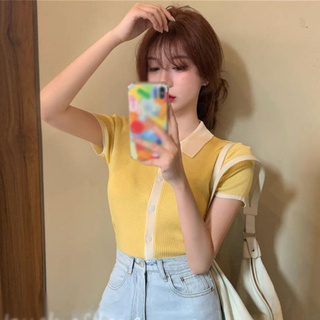Áo Thun Dệt Kim Tay Ngắn Cổ Chữ V Phong Cách Hàn Quốc