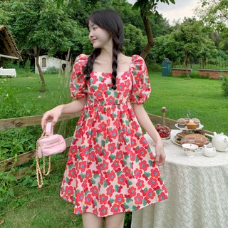 Đầm Hoa Tay Phồng Ngắn Cổ Vuông Thời Trang Mùa Hè Hàn Quốc