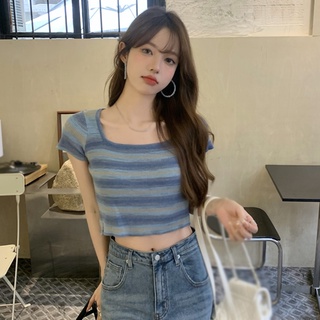Áo Thun Ngắn Tay Cổ Vuông Họa Tiết Kẻ Sọc Phong Cách Hàn Quốc Cho Nữ