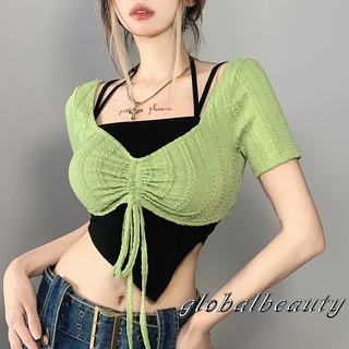 Áo Croptop Hai Dây Và Áo Sơ Mi Tay Ngắn Màu Xanh Lá Phối Dây Rút Thời Trang Dành Cho Nữ