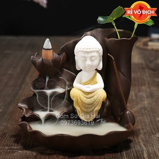 Thác khói trầm hương đèn led Phật Di Lặc liệu pháp hương thơm kèm hoa sen và hạt tràng (Tặng10 nụ trầm)