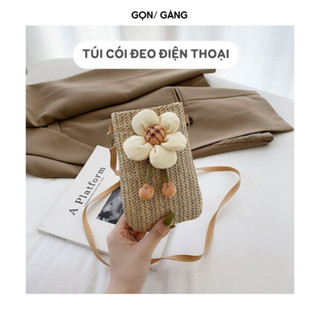 Túi cói đựng điện thoại đeo chéo đi biển đi du lịch có cúc bấm quai da thời trang vintage có thể điều chỉnh Gọn Gàng