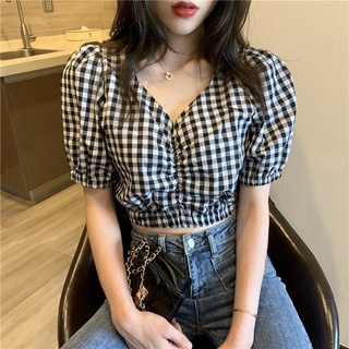 Áo sơ mi NZN tay phồng ôm dáng họa tiết sọc caro thời trang mùa hè dành cho nữ