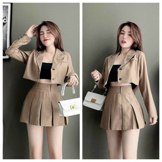 Set bộ 3 món áo khoác ngắn mix váy chữ A cùng áo croptop năng động siêu xinh mặc đi chơi