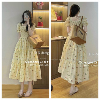 Đầm hoa maxi dự tiệc hoặc đi biển cổ vuông tay ngắn phồng xẻ tà chất liệu voan có 1 màu như hình (nu )