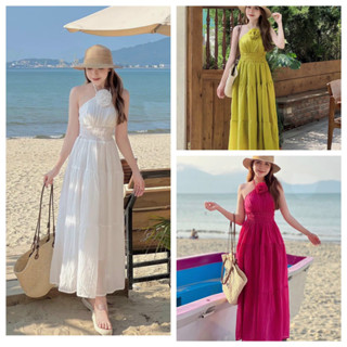 Đầm maxi dài nữ chất kate thiết kế cổ yếm đính hoa tôn dáng mặc đi biển , dã ngoại siêu yêu