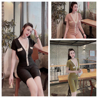 Set bộ chất xốp thiết kế áo cổ V tay ngắn có túi phối quần ngắn lửng năng động thoải mái mặc đi chơi, ở nhà siêu xinh