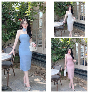 Đầm váy hai dây kết hợp quây lông cúp ngực sexy tôn dáng cho chị em mặc đi tiệc tùng sạng trọng