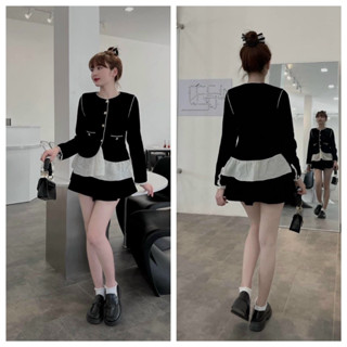 Set bộ áo 2 lớp cổ tròn đính nút phối lớp voan trắng mix váy xòe ngắn phong cách tiểu thư siêu xinh , trẻ trung