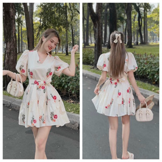 Đầm hoa xòe ngắn thiết kế cổ trụ cùng tay phồng thắt dây ở eo siêu xinh, vintage cho nàng mặc đi dã ngoại