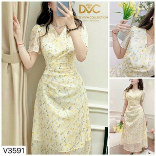 Váy đầm nữ chất xốp hoa họa tiết cổ V tay phồng chạy viền eo dáng xòe dành cho các nàng đi chơi, dự tiệc siêu xinh