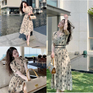 Váy đầm nữ chất voan có lót cổ V đính cườm eo họa tiết hoa nhí xinh xắn váy dài siêu xinh