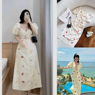 Váy đầm nữ cổ vuông tay phồng in hoa khoét ngực rút dây quyến rũ váy dài siêu xinh