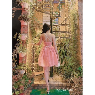 Váy gấm hở lưng hoạ tiết nổi tay bồng xinh xắn H.H.P