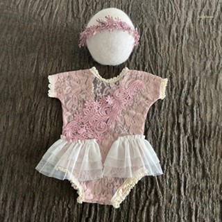 Bộ Áo Liền Quần Phối Ren + Băng Đô Xinh Xắn Dùng Chụp Ảnh Cho Bé Sơ Sinh