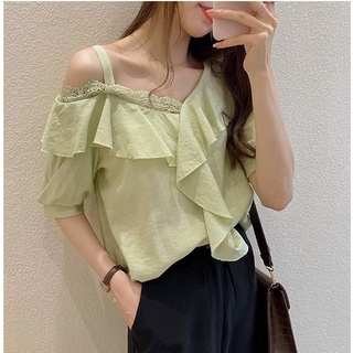 Áo trễ vai 2 dây nữ, Áo kiểu nhún bèo phối ren tay lỡ phong cách nữ bánh bèo ALE54