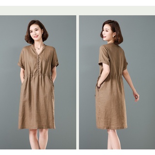 Đầm linen dáng Suông Cổ V Phối Cúc Thắt Dây Eo Chất Đũi Mềm Mát Da172