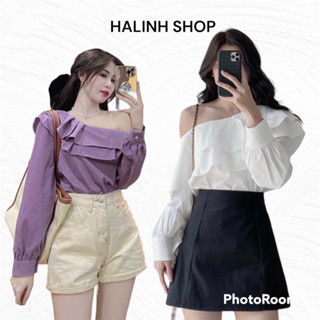 Áo Lệch Vai Nữ Bèo Tầng Tiểu Thư - Halinh Shop - Áo Sơ Mi Dài Tay Bo Bèo Ngực Hàn Quốc size S M