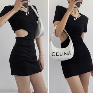 Đầm body khoét eo dáng ngắn V9 cổ tròn tay ngắn dúm 2 bên hông trẻ trung năng động quyến rũ mẫu mới năm 2023