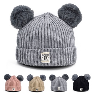 Mũ Beanie Đan Len Dày Dặn Màu Trơn Đính Hai Quả Bông Dễ Thương Thời Trang Thu Đông Cho Bé 3-24 Tháng Tuổi