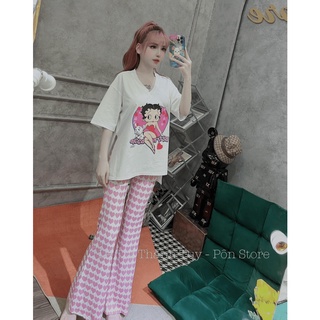 (Free Ship) SÉT BỘ NỮ ÁO THUN CÔNG CHÚA HỒNG PHỐI QUẦN TRÁI TIM ỐNG LOE SIU SANG CHẢNH MM7 HHp Fashion