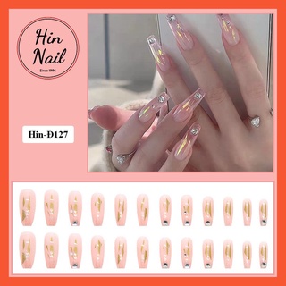 Móng tay giả đính đá Hin Nail màu hồng ánh nhũ họa tiết trái tim