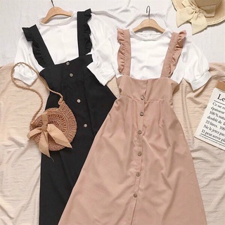 Set đầm yếm hở lưng, đầm yếm dáng dài thiết kế vai cánh tiên phối kèm áo thun nữ form rộng