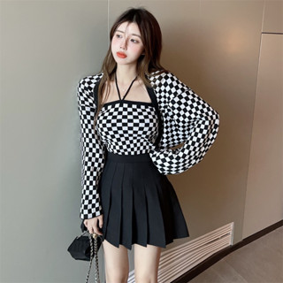Set áo dơi kẻ kèm chân váy xếp li đen ảnh thật