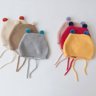 Mũ len màu trơn có gắn bóng bằng bông mịn cho trẻ em xinh xắn