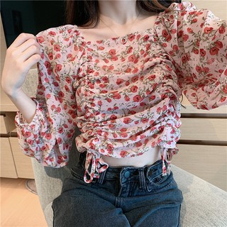 Áo kiểu IELGY chiffon dáng ngắn dây rút cổ vuông in họa tiết hoa phong cách phương Tây cổ điển xinh xắn cho nữ