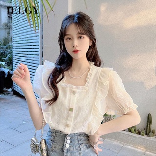 Áo sơ mi IELGY tay ngắn cổ vuông phối bèo phong cách Pháp dành cho nữ