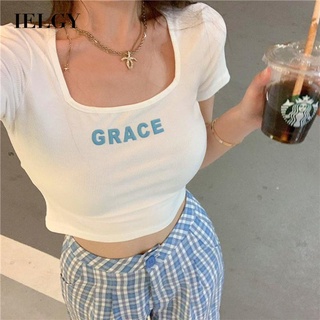 Áo thun IELGY tay ngắn cổ vuông in chữ thời trang cho nữ