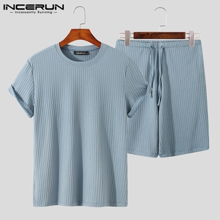 Bộ Quần Short + Áo INCERUN Tay Ngắn Kẻ Sọc Có Dây Rút Thời Trang Mùa Hè Cho Nam
