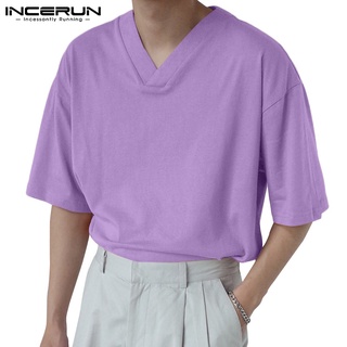 Áo thun nam INCERUN dáng thụng màu trơn tay ngắn cổ V thời trang thường ngày