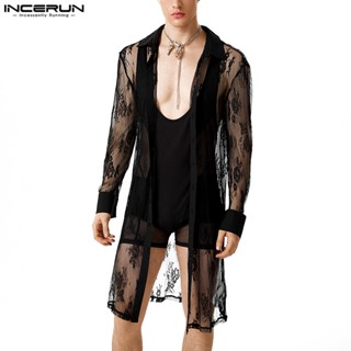 Áo liền quần INCERUN tay dài cổ bẻ may ghép lưới xuyên thấu dành cho nam giới