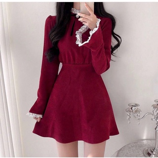 Váy nữ cổ ren bèo tay xòe chất nhung tăm dáng xòe xinh xắn đầm dự tiệc sang trọng