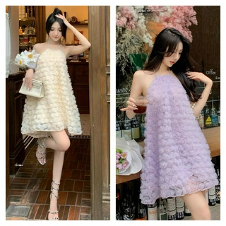 Đầm nữ thiết kế cổ yếm dáng xòe chất ren hoa hồng đầm dự tiệc sang trọng