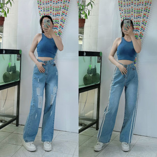 [ Jeans Clothing ] Quần jean ống rộng cạp cao rách kiểu - Quần bò nữ dáng suông - chất jean mềm không dãn