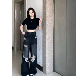 Quần jean nữ ống rộng rách bụi cá tính, Quần bò suông hack dáng trẻ trung năng động