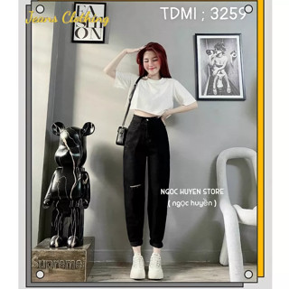 Quần jean baggy nữ loang khói trơn, Quần bò nữ cạp cao rách kiểu mẫu mới