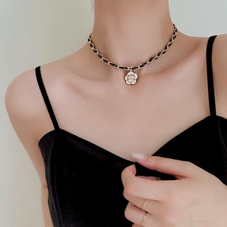 Vòng Cổ Da Màu Đen Phối Mặt Kim Loại Hình Hoa Trà Thời Trang