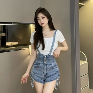 Jiashucheng Quần Yếm Denim Ngắn Hai Dây Lưng Cao Dây Rút Bên Ngực Có Thể Tháo Rời Phong Cách Mùa Hè Cho Nữ