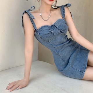 Jiashucheng Váy Denim Ôm Hông Thắt Nơ Phong Cách Retro Jiashucheng Mới