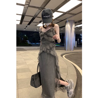 Jiashucheng Đầm Hai Dây Dáng Dài Tới Mắt Cá Chân Mỏng Ôm Eo Phong Cách Retro Màu Trơn Phong Cách Desire Cho Nữ