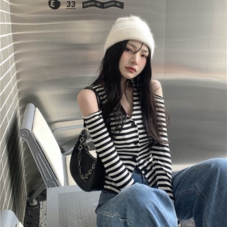 Jiashucheng Áo Dệt Kim Trễ Vai Cổ Chữ V Họa Tiết Kẻ Sọc Thời Trang Hè Thu Phong Cách Mới Cho Nữ