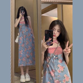 Jiashucheng Xiaoxiangfeng Đầm Hai Dây Denim Mỏng Họa Tiết Hoa Ngọt Ngào Xinh Xắn Cho Nữ