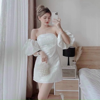 Đầm thời trang nữ mặc đi tiệc chất xốp gân cúp ngực có mút tay phồng màu trắng