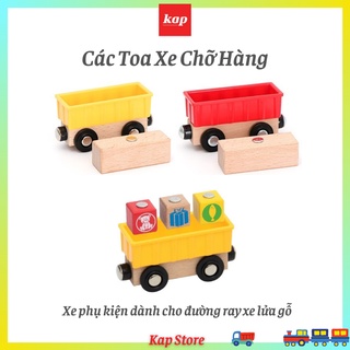 Toa xe lửa chỡ hàng, các khối gỗ hàng hóa, sản phẩm chơi cùng đường ray xe lửa gỗ