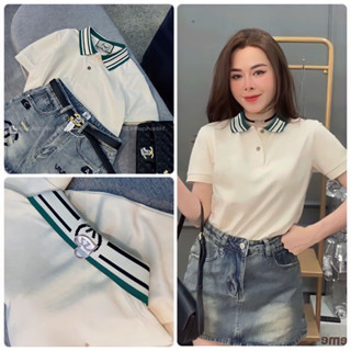 Áo polo nữ phối cổ kẻ xanh 2 màu trắng be