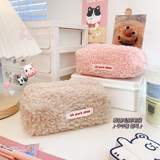 Túi Đựng Bút/Mỹ Phẩm Bằng Len Phối Lông Cừu Dễ Thương Có Sức Chứa Lớn Phong Cách Hàn Quốc
